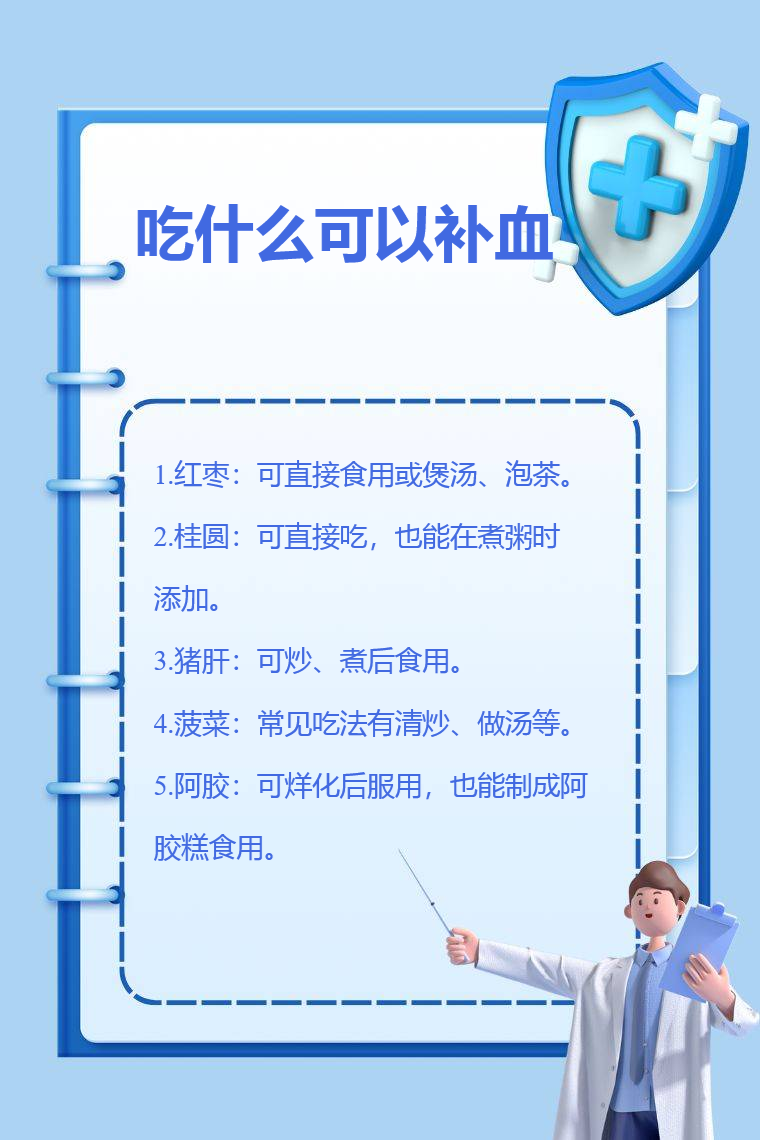 吃红枣、桂圆、猪肝、菠菜、阿胶等有助于补血。