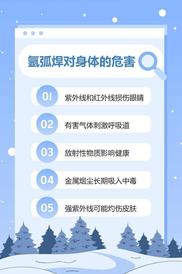 3. 放射性伤害:氩弧焊使用的钍钨极含有放射性物质,在焊接过程中会产生放射性气溶胶,若防护不当,可能会对人体造成放射性伤害,影响造血功能等。
