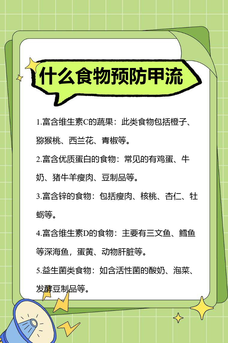 预防甲流可从富含维生素C的蔬果、富含优质蛋白的食物、富含锌的食物、富含维生素D的食物、益生菌类食物等入手。