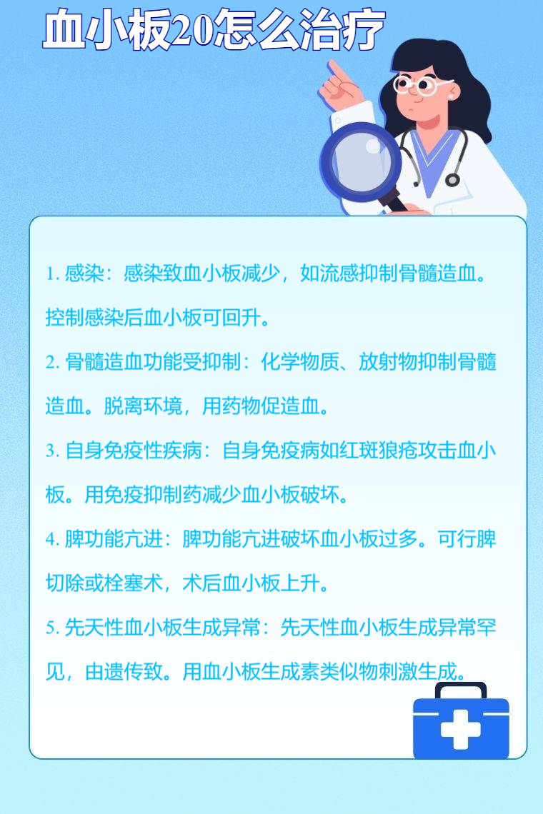 血小板20可能是感染、骨髓造血功能受抑制、自身免疫性疾病、脾功能亢进、先天性血小板生成异常等因素,需要针对病因治疗,可采取的方法有抗感染、促进造血、调节免疫、治疗脾功能亢进、补充血小板生成相关物质等。