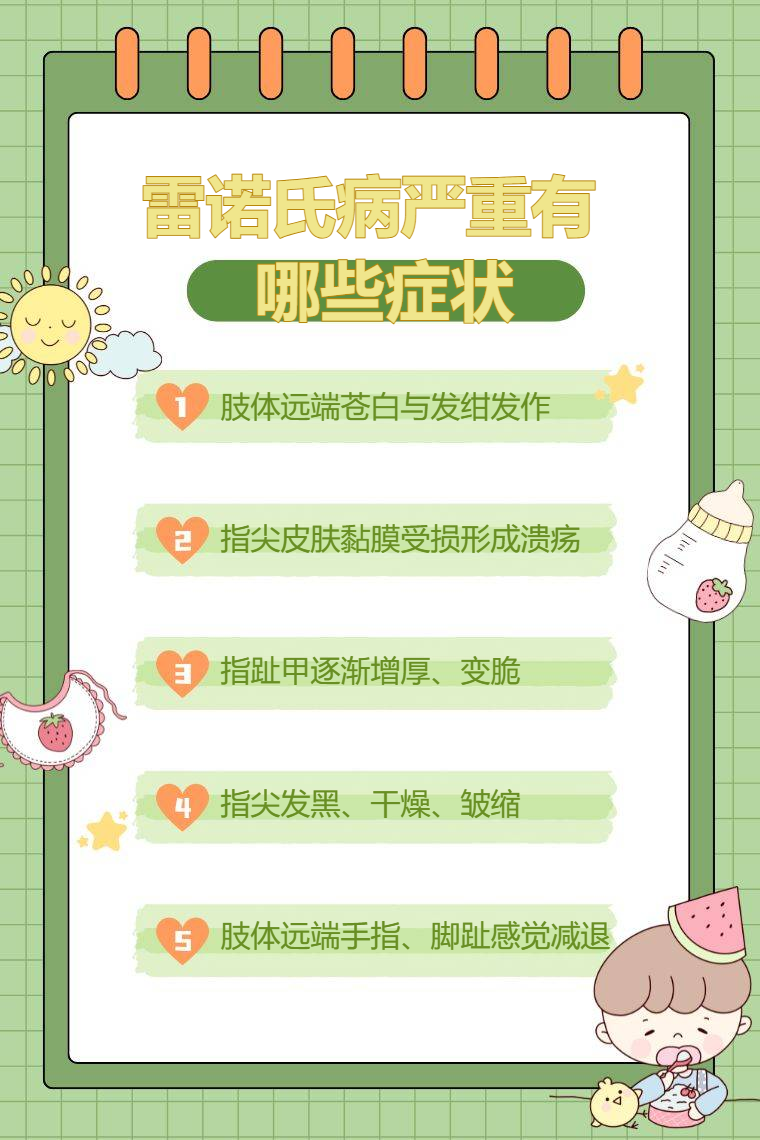 雷诺氏病严重时可出现肢体远端苍白与发绀、指尖溃疡、指趾甲增厚变形、指尖坏疽、肢体感觉减退或消失等。