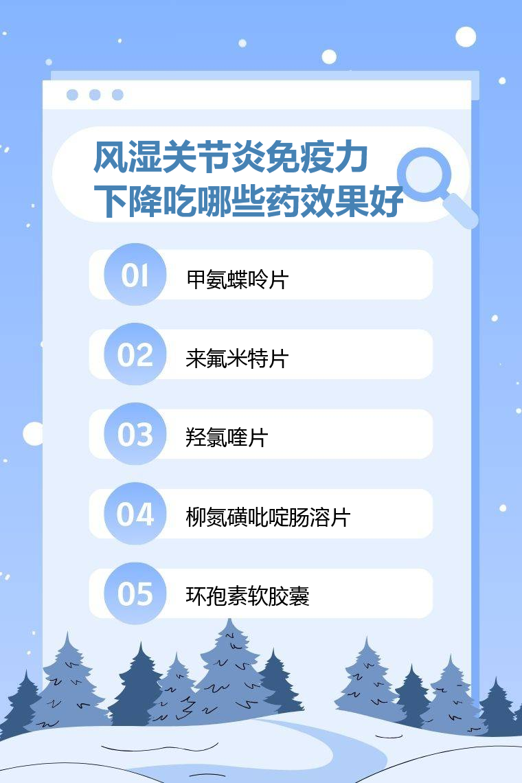 风湿关节炎患者免疫力下降一般吃甲氨蝶呤片、来氟米特片、羟氯喹片、柳氮磺吡啶肠溶片、环孢素软胶囊等药效果好,上述药物需遵医嘱使用。