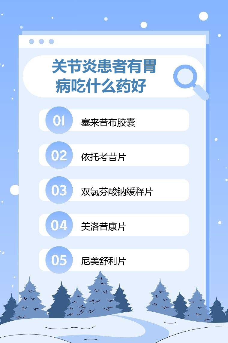 关节炎患者伴胃病选用塞来昔布胶囊、依托考昔片、双氯芬酸钠缓释片、美洛昔康片、尼美舒利片等药比较好,具体用药需结合个体病情、耐受情况及合并疾病,务必遵医嘱使用药物。
