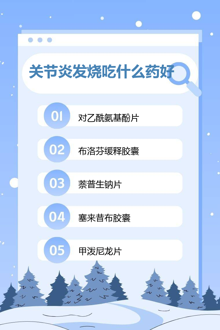 关节炎患者出现发烧症状时,一般用对乙酰氨基酚片、布洛芬缓释胶囊、萘普生钠片、塞来昔布胶囊、甲泼尼龙片等药物比较好,用药前需明确病因并严格遵医嘱使用药物。