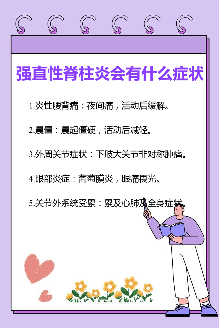 强直性脊柱炎的症状包括炎性腰背痛、晨僵、外周关节肿痛、眼部炎症、关节外系统受累等。