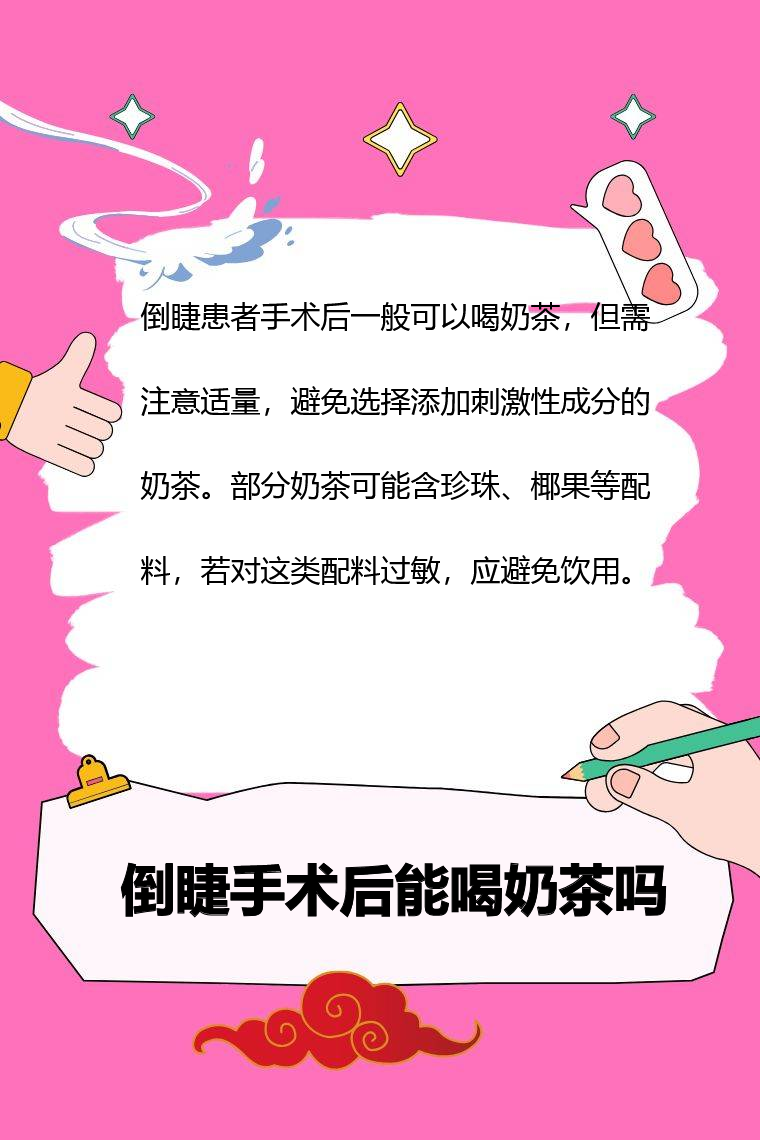 倒睫患者手术后一般可以喝奶茶,但需注意适量,避免选择添加刺激性成分的奶茶。