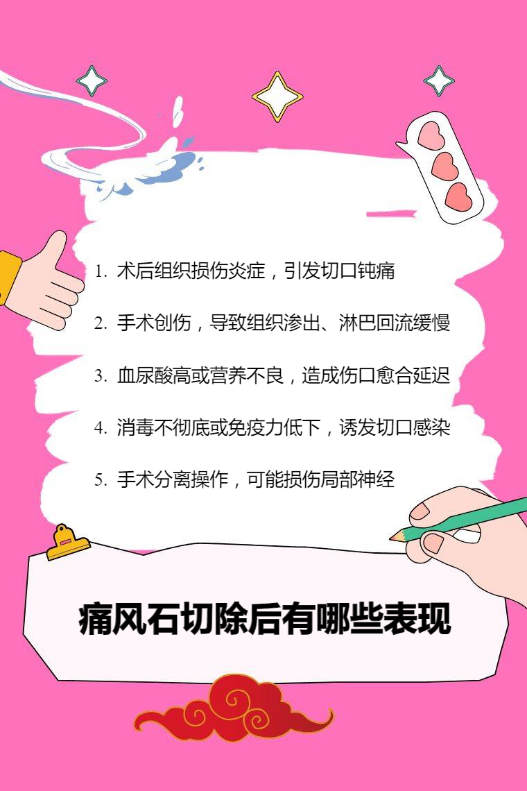 痛风石切除后常见表现包括伤口疼痛、局部肿胀、切口愈合延迟、感染、神经损伤等。