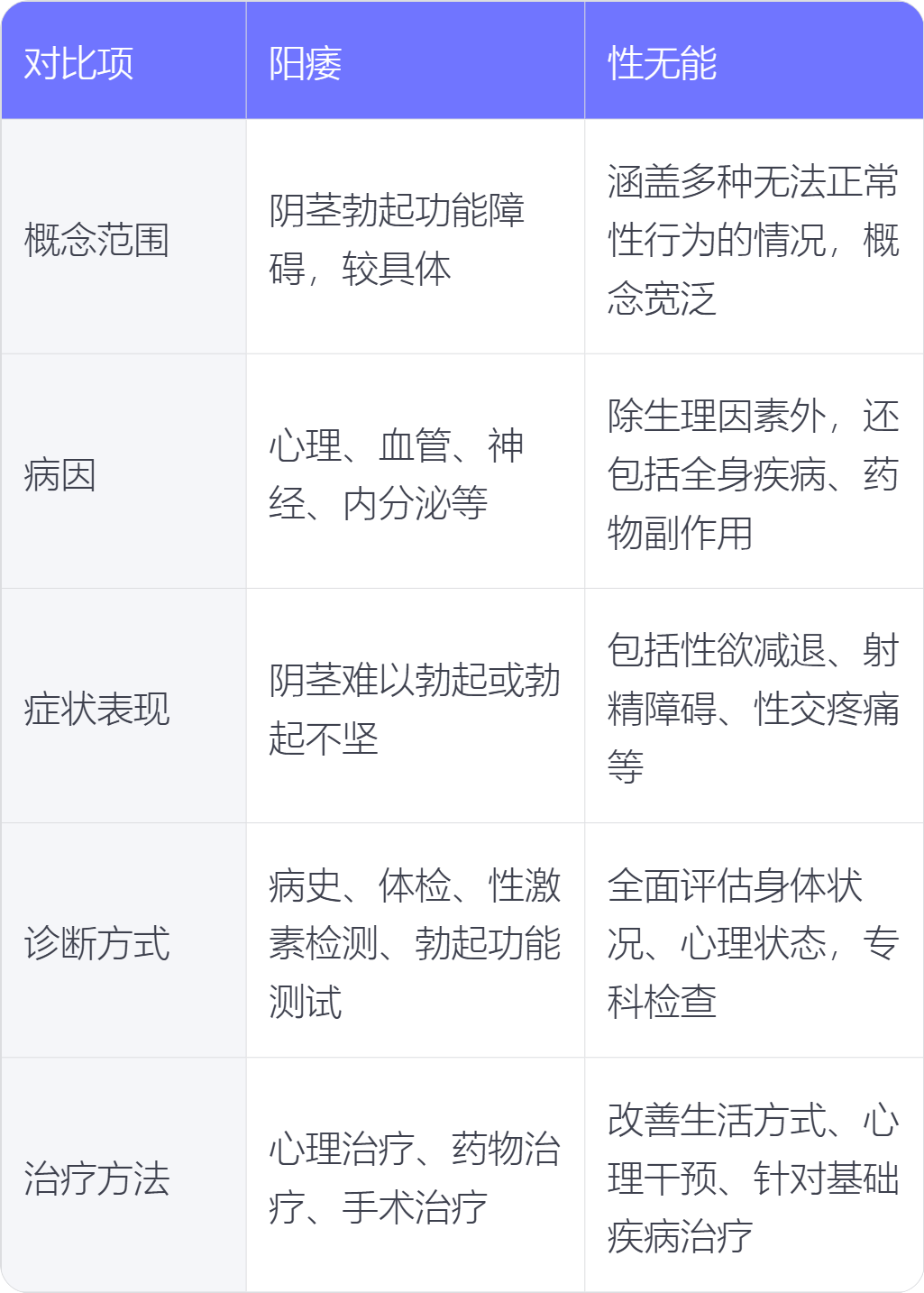1. 概念范围:阳痿是指阴茎勃起功能障碍,是一种较为具体的性功能障碍类型。性无能则是一个更宽泛的概念,涵盖了各种导致无法进行正常性行为的情况,包括心理性、器质性等多种因素引起的性功能问题。