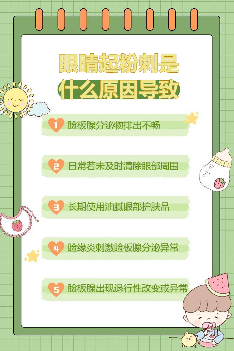 眼睛起粉刺多与睑板腺分泌物排出受阻、眼部清洁不足、长期使用油腻眼部护肤品、睑缘炎、睑板腺功能障碍等因素有关,需结合具体表现判断。