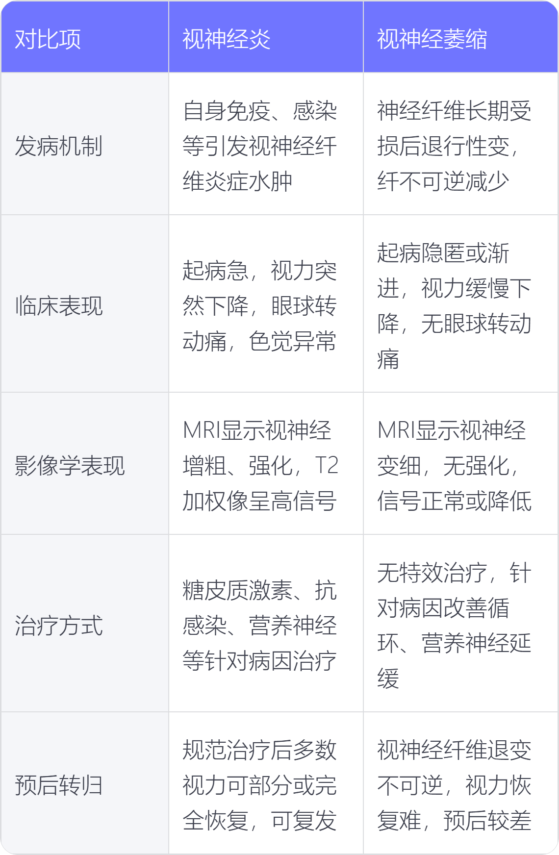 视神经炎与视神经萎缩属于不同类型的视神经病变,二者在发病机制、临床表现、影像学表现、治疗方式、预后转归上存在差异。