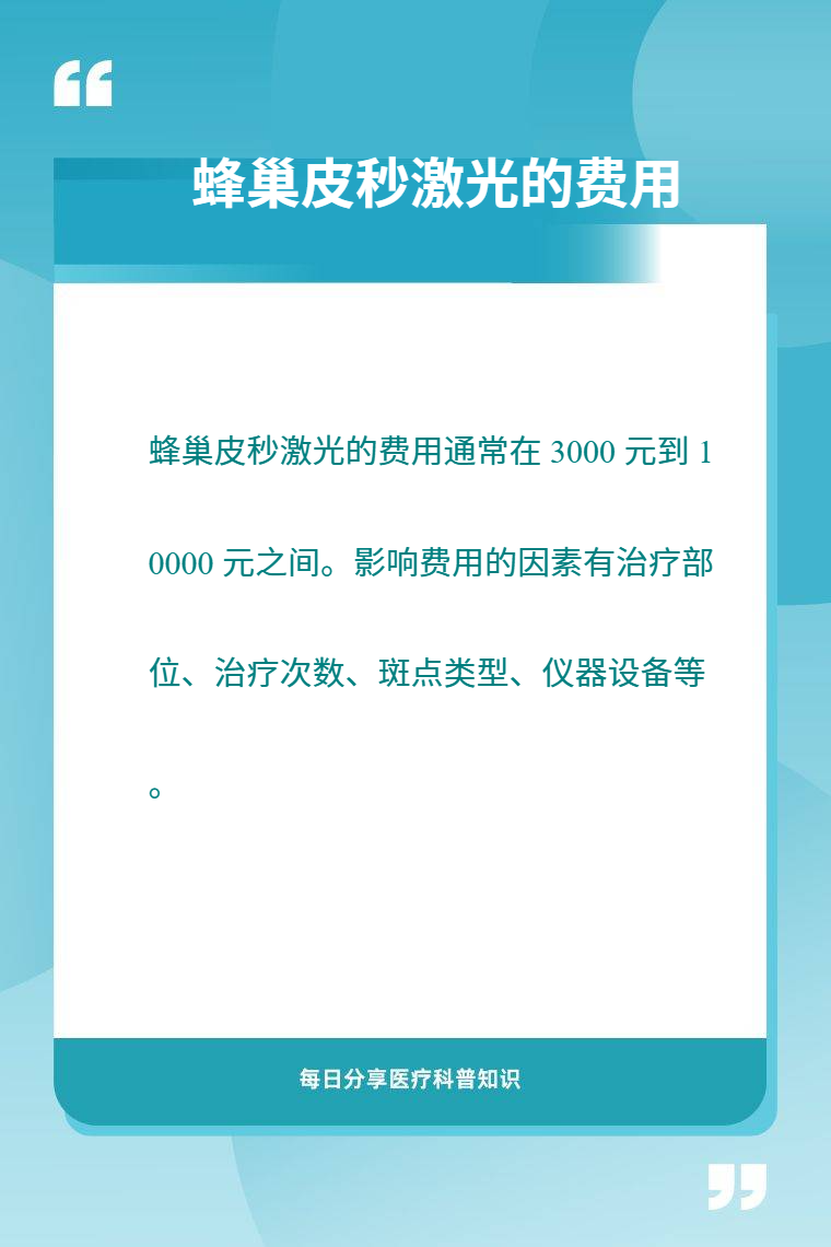 蜂巢皮秒激光的费用通常在 3000 元到 10000 元之间。影响费用的因素有治疗部位、治疗次数、斑点类型、仪器设备等。