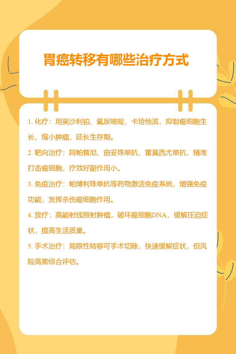 胃癌转移常见的治疗方式有化疗、靶向治疗、免疫治疗、放疗、手术治疗等。