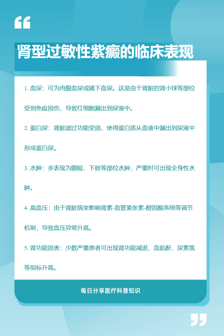 肾型过敏性紫癜的临床表现有血尿、蛋白尿、水肿、高血压、肾功能损害等。