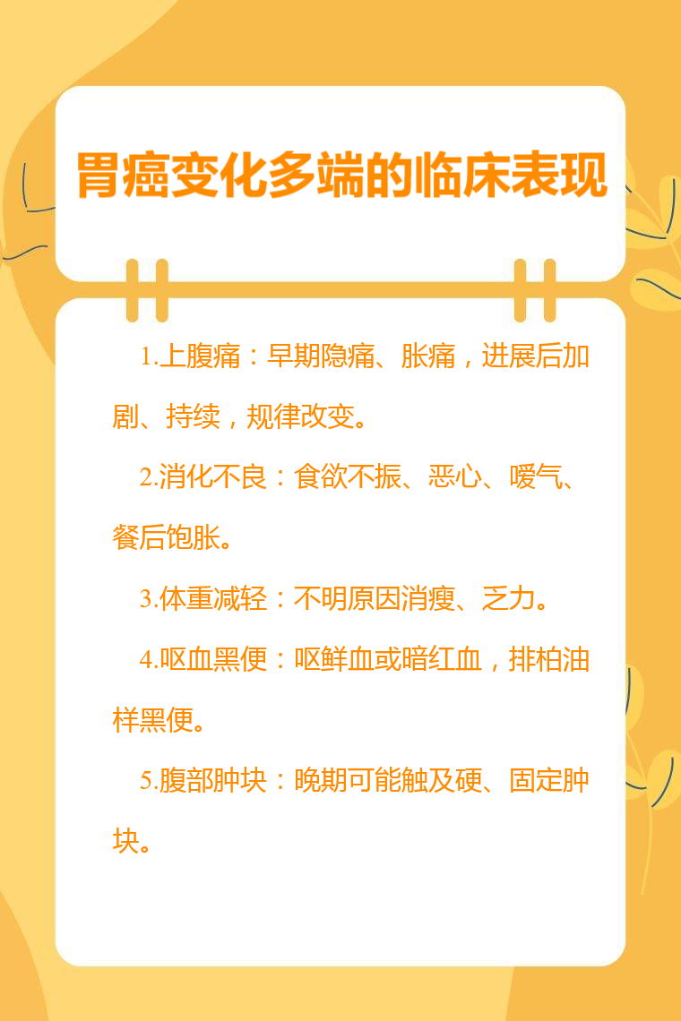 胃癌的临床表现多样,包括上腹部疼痛、消化不良、体重减轻、呕血黑便、腹部肿块等。