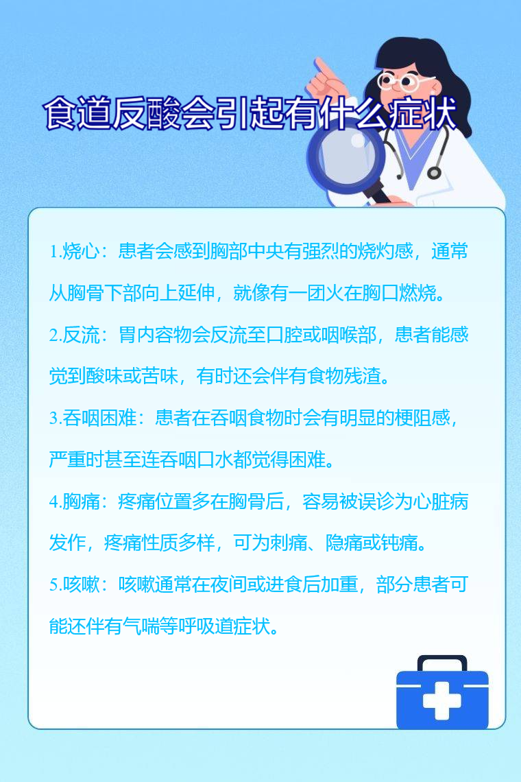 食道反酸会引起烧心、反流、吞咽困难、胸痛、咳嗽等症状。