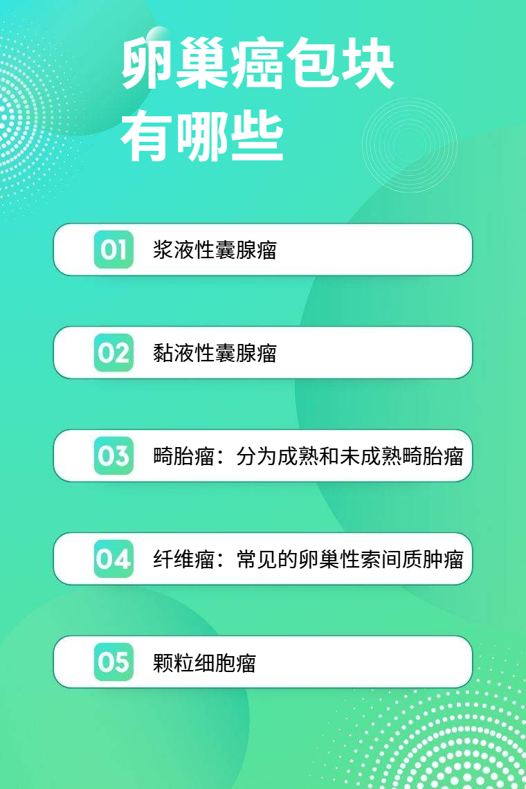卵巢癌包块有浆液性囊腺瘤、黏液性囊腺瘤、畸胎瘤、纤维瘤、颗粒细胞瘤等。