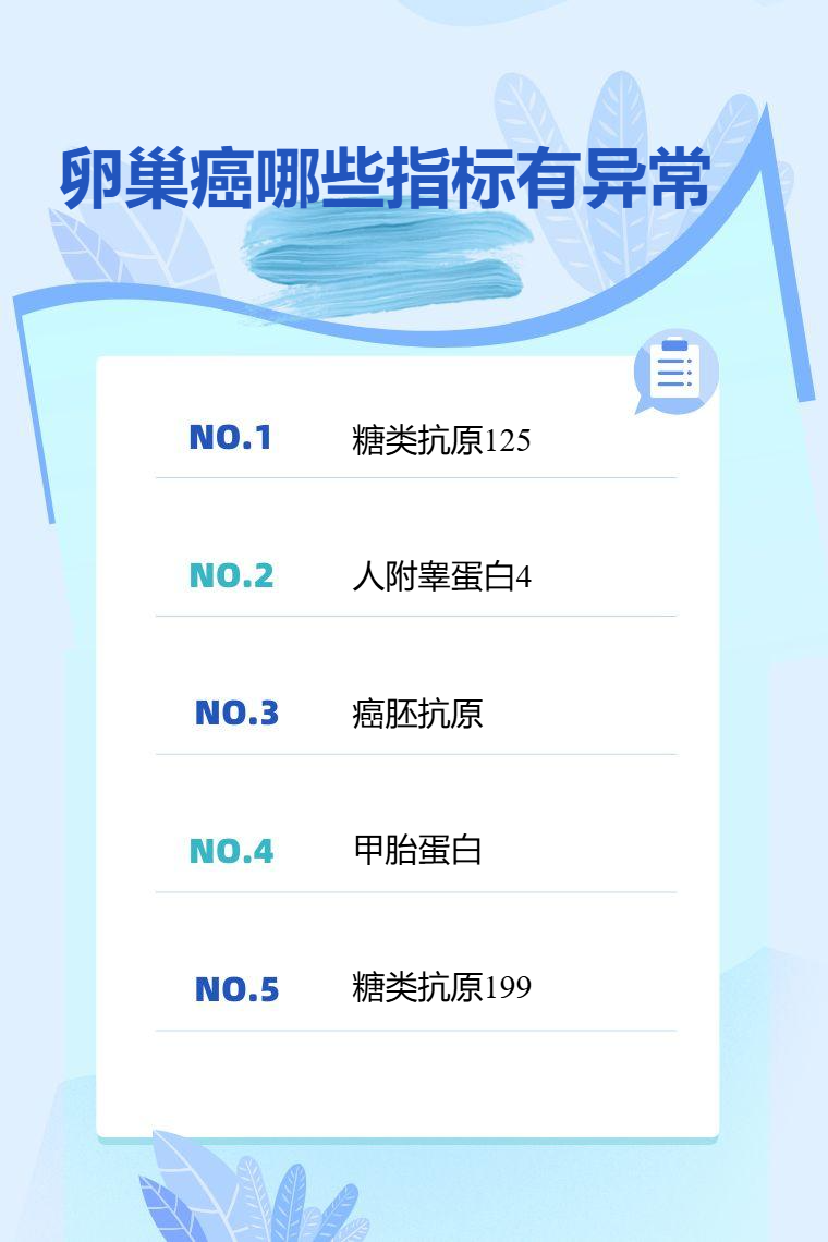 卵巢癌常见异常指标有糖类抗原125、人附睾蛋白4、癌胚抗原、甲胎蛋白、糖类抗原199等。