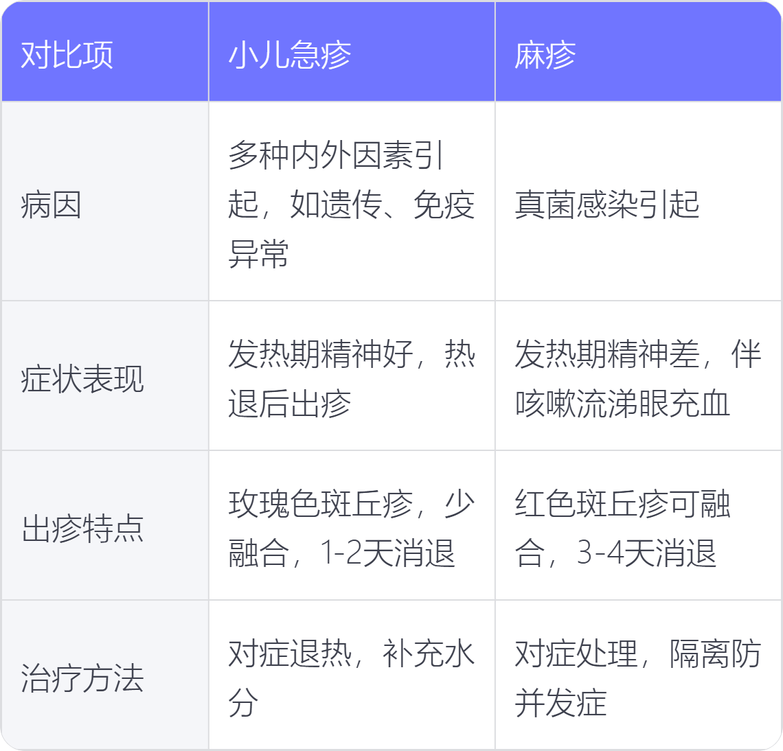 小儿急疹与麻疹在病因、症状表现、出疹特点、治疗方法等方面存在不同。