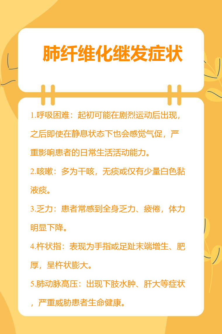肺纤维化继发症状有呼吸困难、咳嗽、乏力、杵状指、肺动脉高压等。