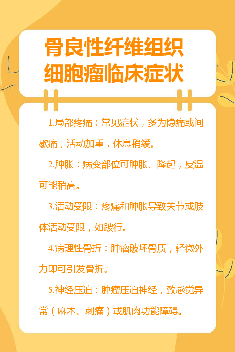 骨良性纤维组织细胞瘤临床症状包括局部疼痛、肿胀、活动受限、病理性骨折、神经压迫症状等。