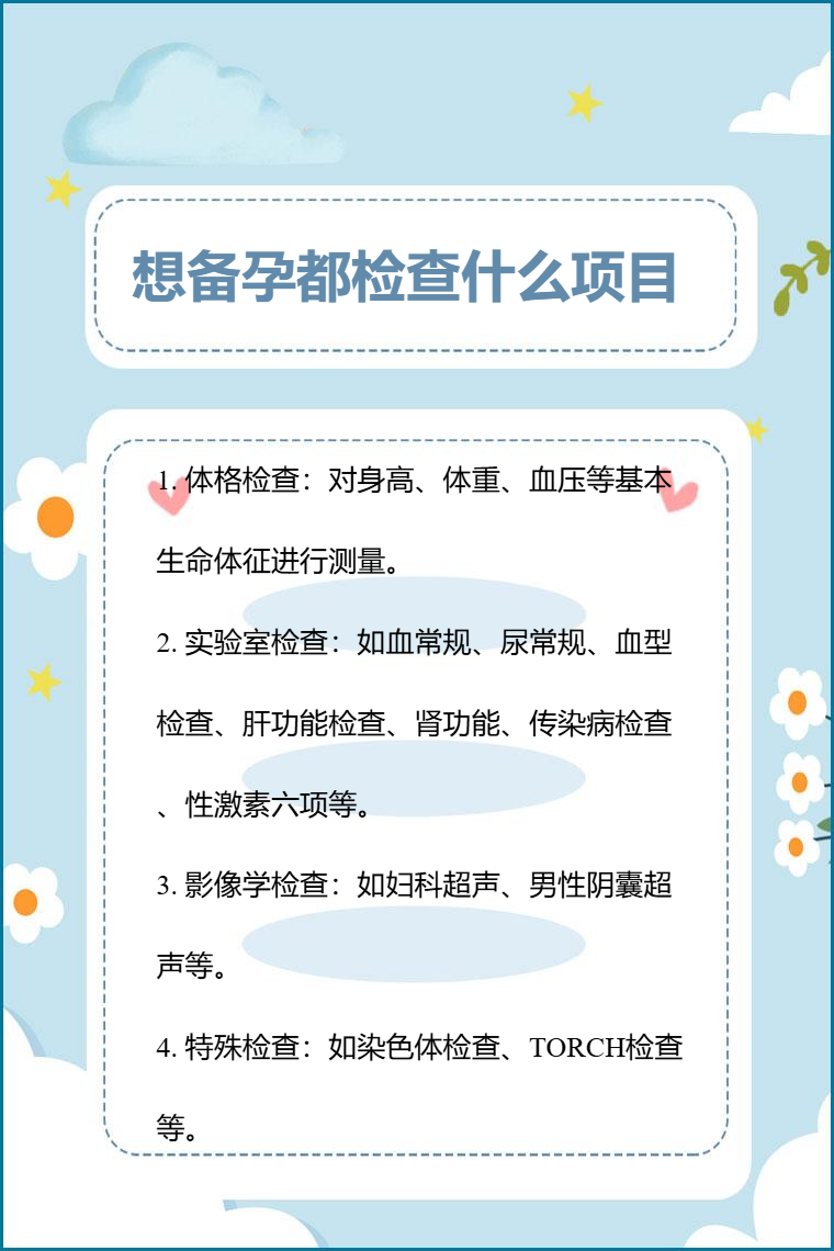 备孕检查项目包括体格检查、实验室检查、影像学检查、特殊检查等。