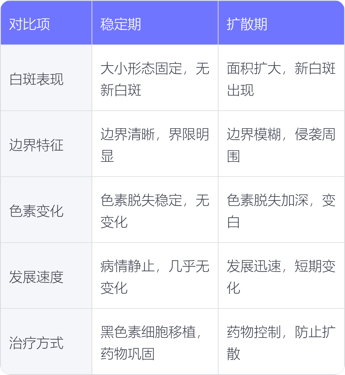 4. 发展速度:稳定期病情处于相对静止状态,几乎没有发展变化;扩散期病情发展迅速,白斑在短时间内就可能出现明显变化。