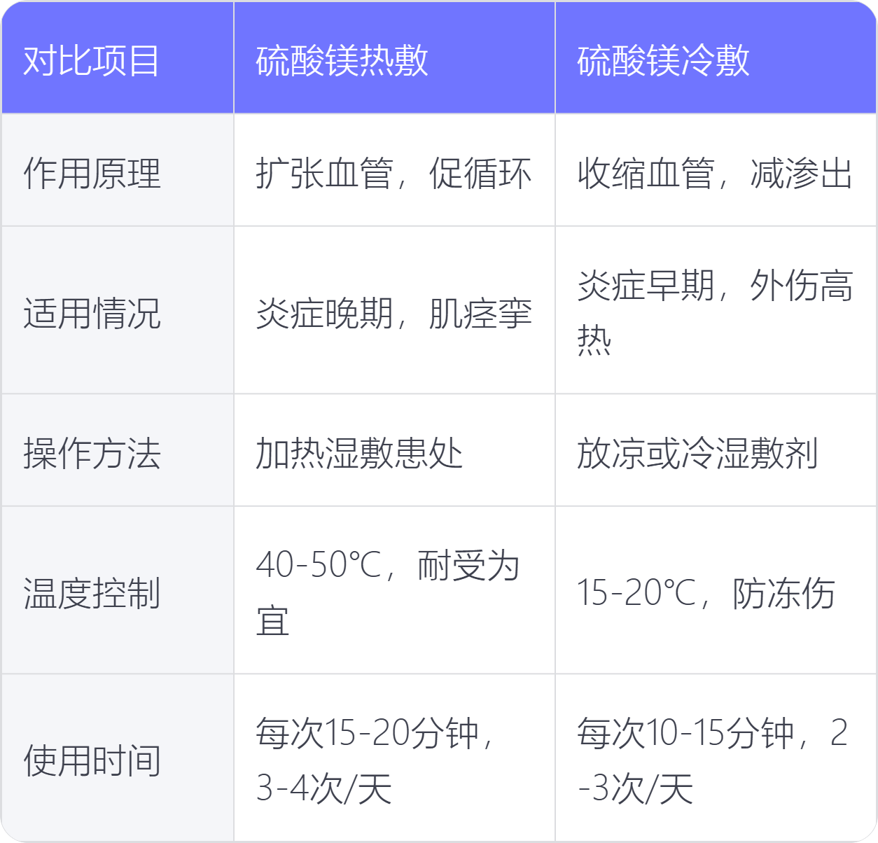 硫酸镁热敷和冷敷在作用原理、适用情况、操作方法、温度控制、使用时间上存在不同。