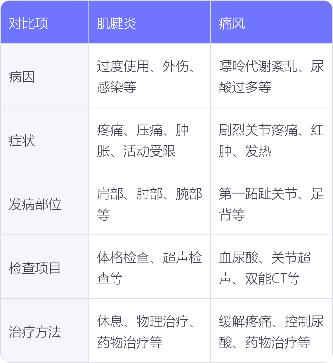 5. 治疗方法:肌腱炎治疗以休息、物理治疗如热敷、按摩、药物治疗非甾体抗炎药等为主,严重时可能需手术;痛风治疗在急性期以缓解疼痛为主,常用秋水仙碱、非甾体抗炎药等,缓解期需控制尿酸水平,使用降尿酸药物。