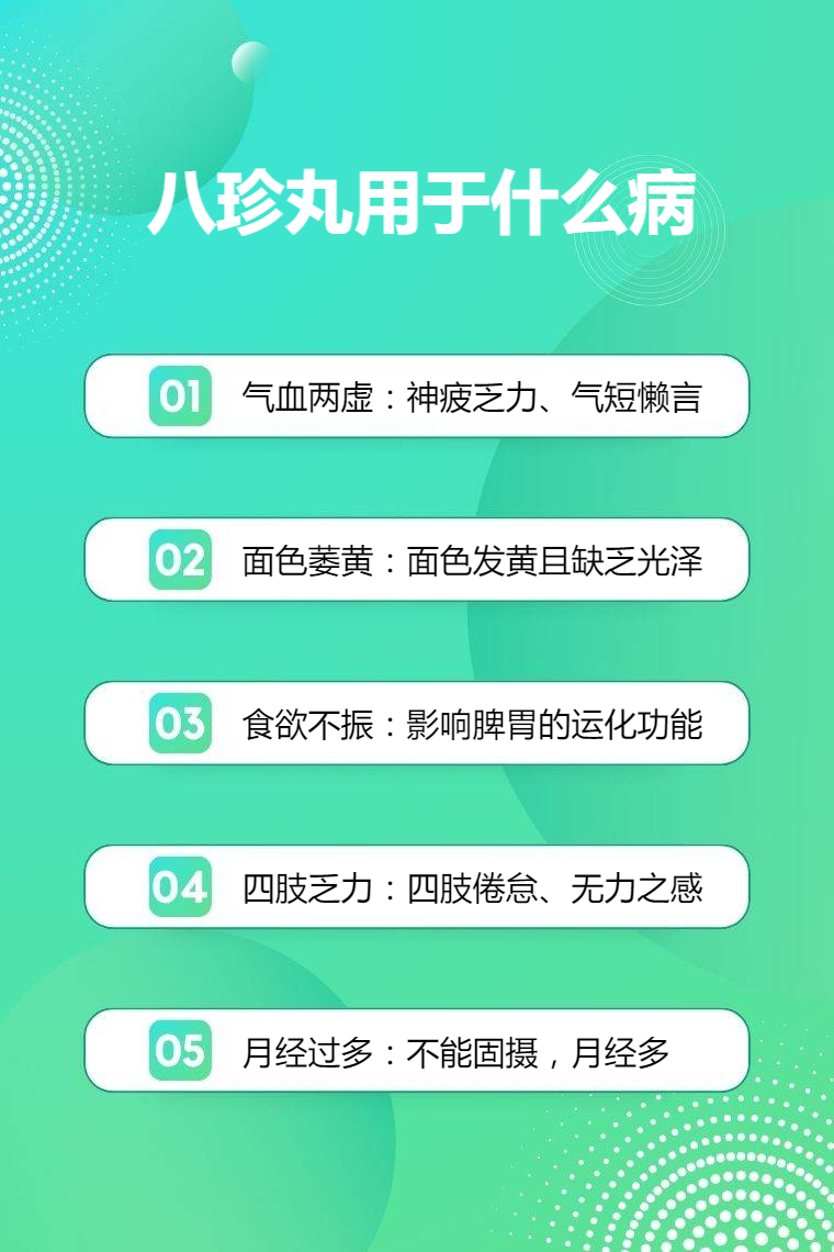 5. 月经过多:气血虚弱不能固摄血液,可引起月经过多。八珍丸通过补益气血,增强身体对血液的统摄能力,调节月经量。