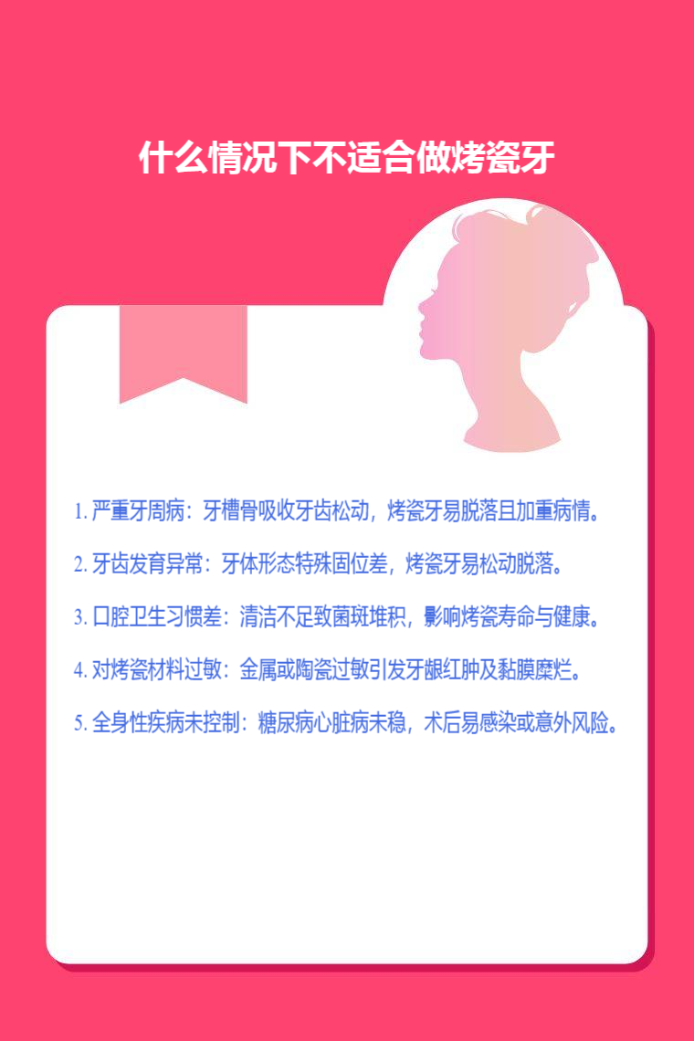 患有严重牙周病、牙齿发育异常、口腔卫生习惯差、对烤瓷材料过敏、患有全身性疾病未控制等情况不适合做烤瓷牙。