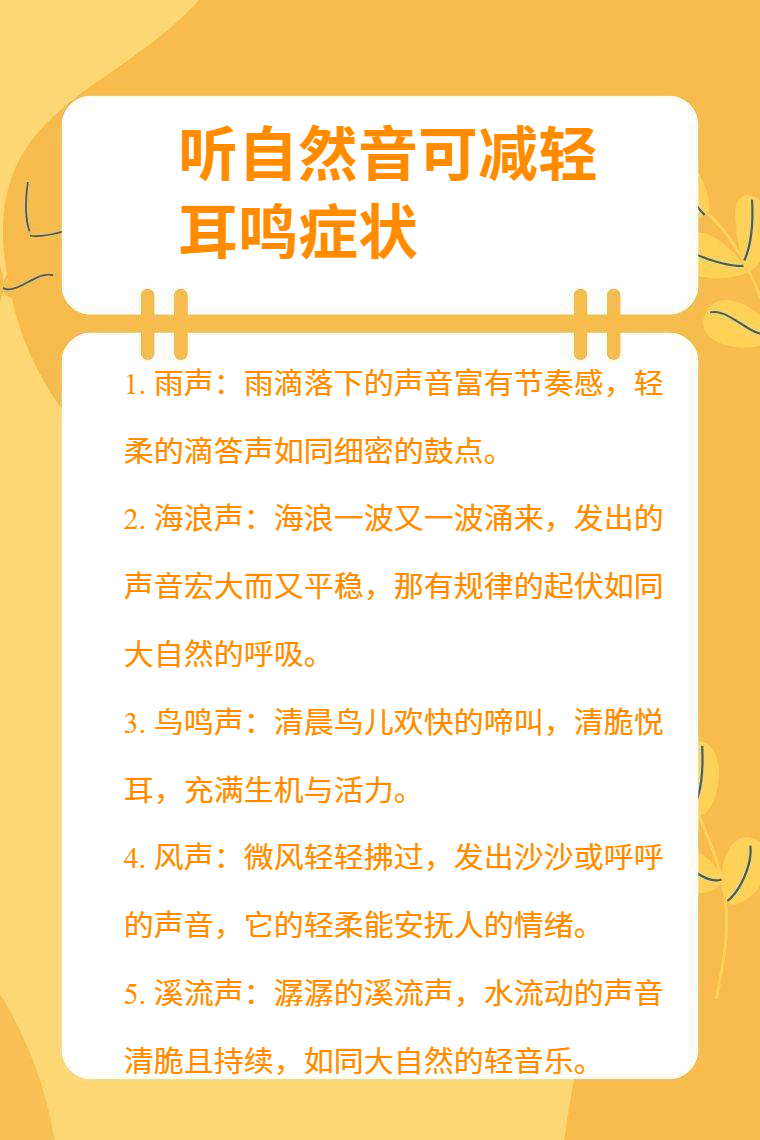 听自然音可减轻耳鸣症状,常见的自然音有雨声、海浪声、鸟鸣声、风声、溪流声等。