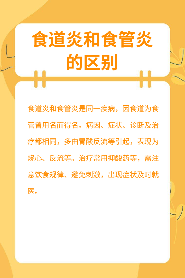 食道炎和食管炎本质上是同一疾病,食道是食管的曾用名,二者所指器官相同,都是连接咽部和胃的消化管道,所以从疾病指代对象来说没有区别。