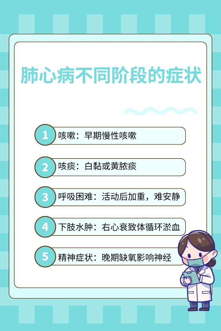 肺心病不同阶段的症状有咳嗽、咳痰、呼吸困难、下肢水肿、精神症状等。