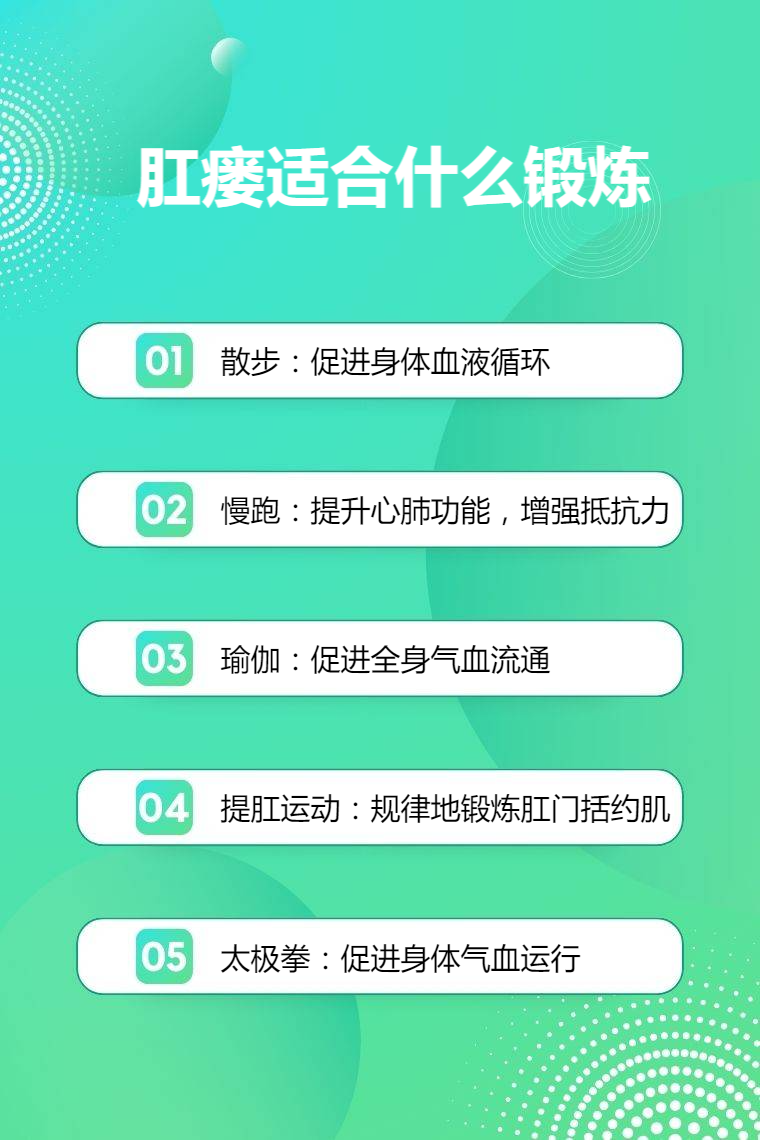 散步、慢跑、瑜伽、提肛运动、太极拳等适合肛瘘患者锻炼。