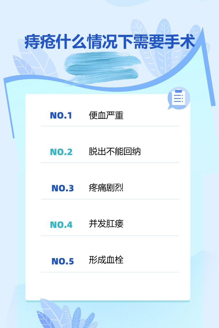 痔疮在便血严重、脱出不能回纳、疼痛剧烈、并发肛瘘、形成血栓等情况下需要手术。