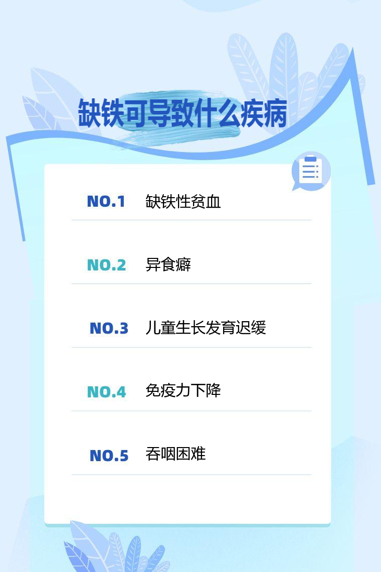 缺铁可导致缺铁性贫血、异食癖、儿童生长发育迟缓、免疫力下降、吞咽困难等。