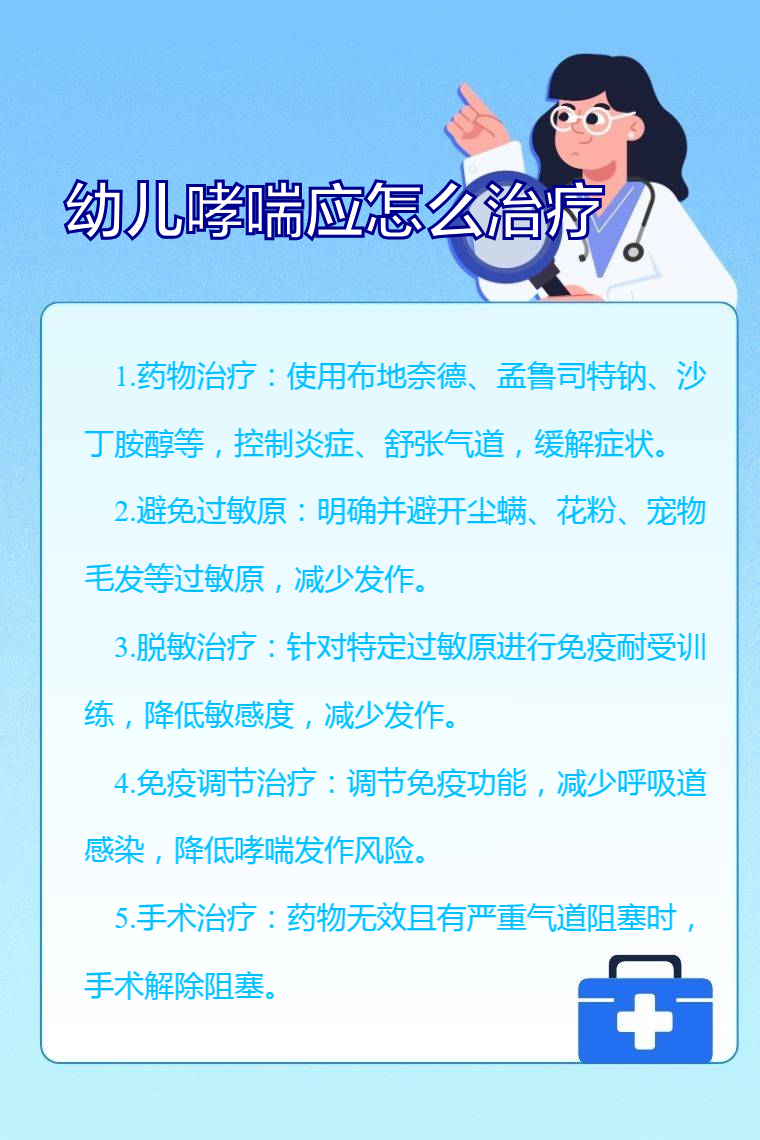 幼儿哮喘的治疗方法主要有药物治疗、避免接触过敏原、脱敏治疗、免疫调节治疗、手术治疗等。