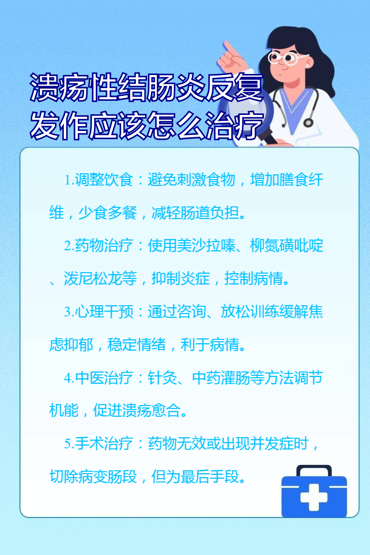 溃疡性结肠炎反复发作可通过调整饮食、药物治疗、心理干预、中医治疗、手术治疗等方法应对。
