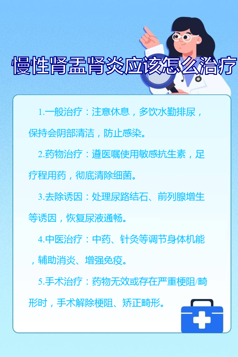 慢性肾盂肾炎的治疗方法主要有一般治疗、药物治疗、去除诱因、中医治疗、手术治疗等。