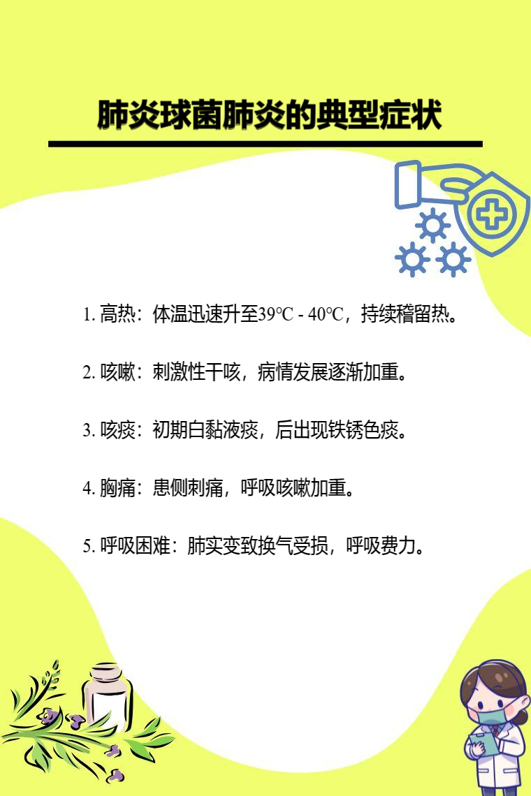 肺炎球菌肺炎的典型症状有高热、咳嗽、咳痰、胸痛、呼吸困难等。