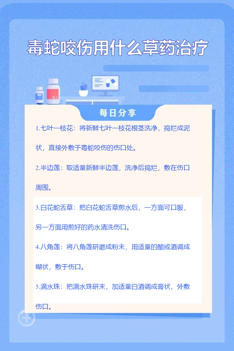 毒蛇咬伤情况危急,使用草药治疗只是初步应急措施。发生毒蛇咬伤后,应尽快前往医院进行专业救治,严格遵循医生的诊断与治疗方案,切不可仅依赖草药而延误病情,以免造成严重后果。