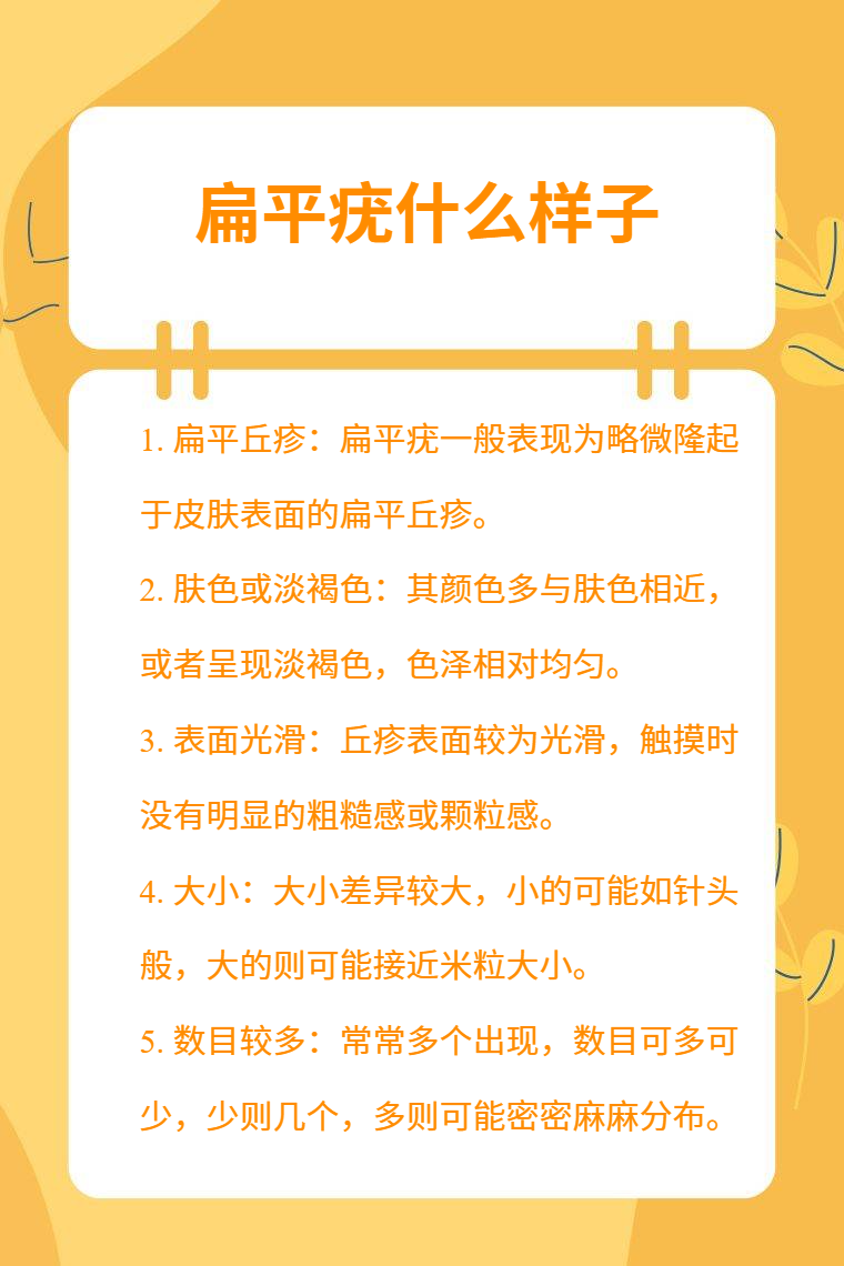 扁平疣通常有扁平丘疹、肤色或淡褐色、表面光滑、大小不一、数目较多等样子。