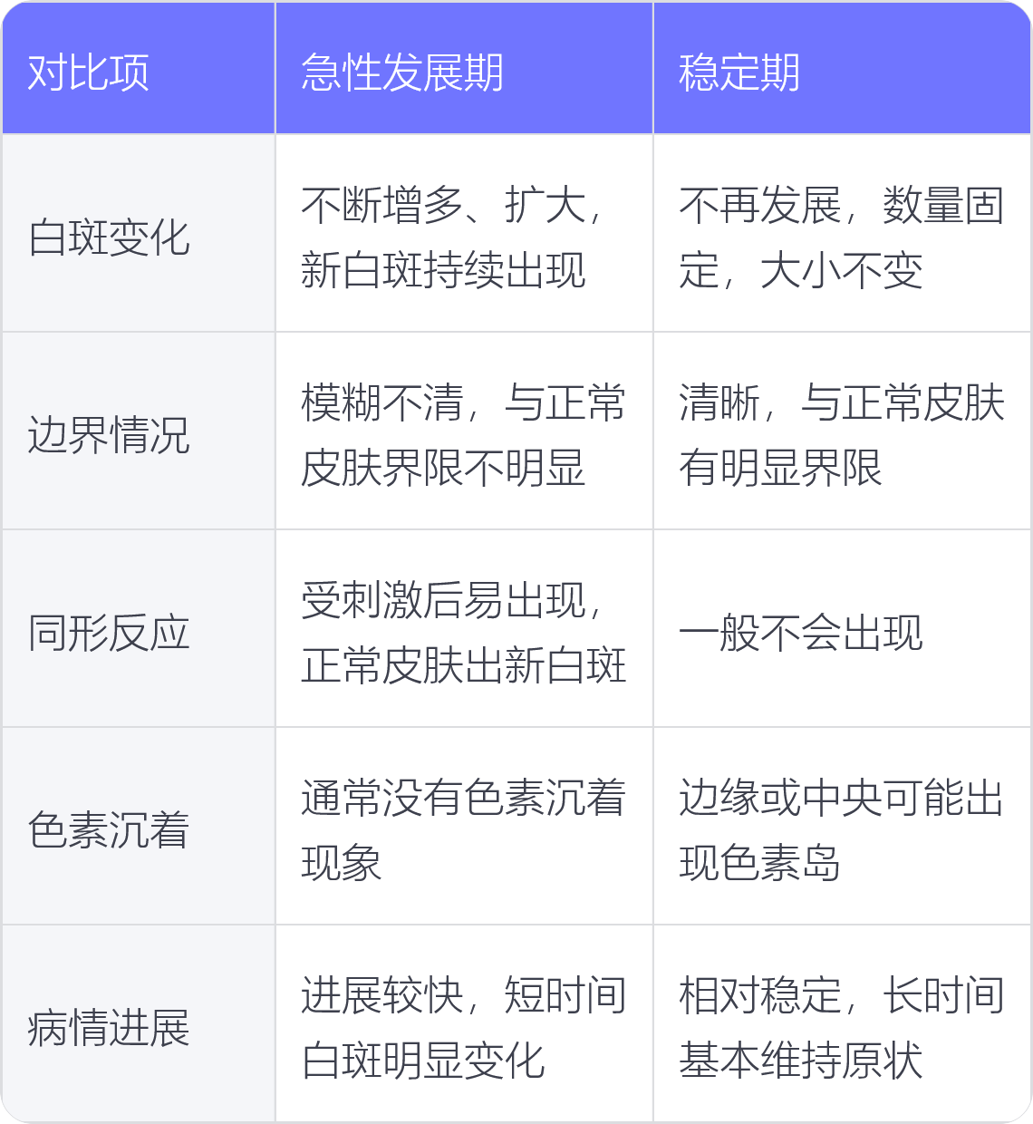 白癜风的急性发展期和稳定期可从白斑变化、边界情况、同形反应、色素沉着、病情进展这几个方面来区别。