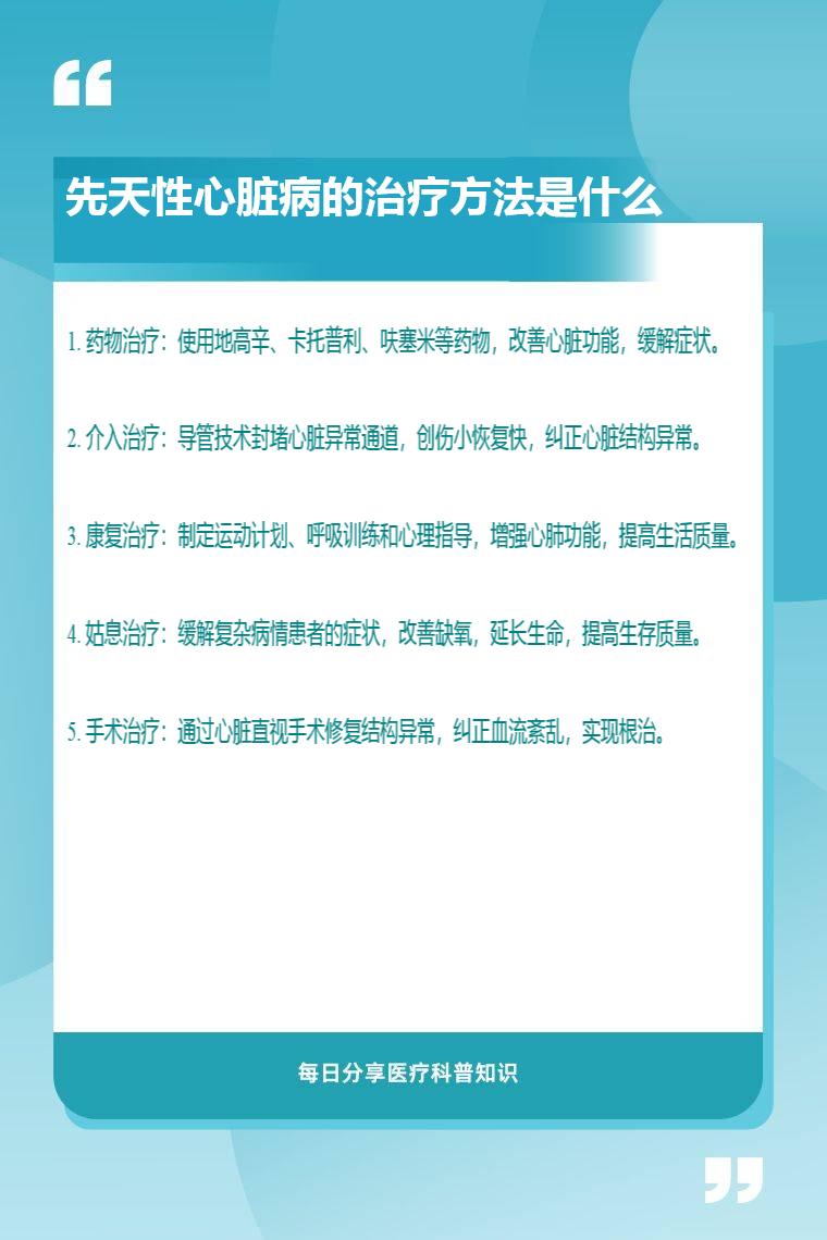 先天性心脏病的治疗方法主要有药物治疗、介入治疗、手术治疗、康复治疗、姑息治疗等。