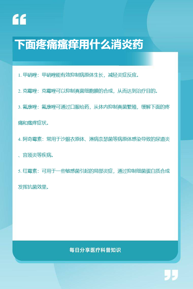 下面疼痛瘙痒可使用的消炎药有甲硝唑、克霉唑、氟康唑、阿奇霉素、红霉素等。