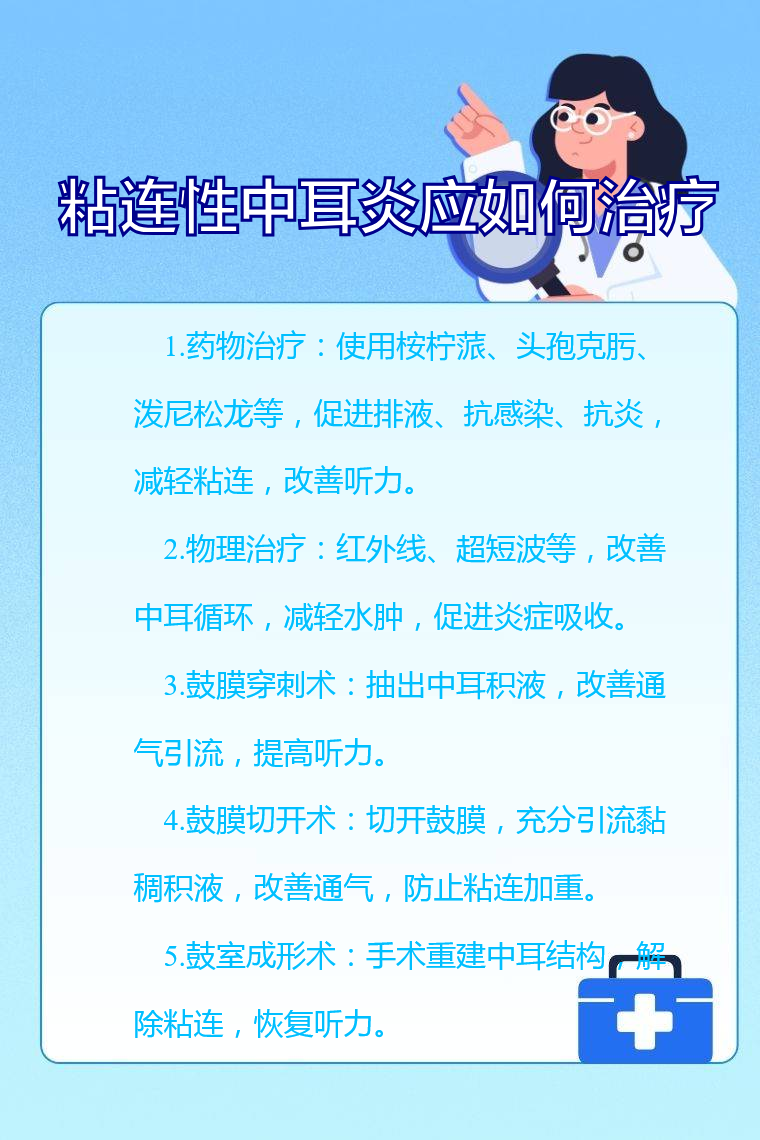 粘连性中耳炎的治疗方法主要有药物治疗、物理治疗、鼓膜穿刺术、鼓膜切开术、鼓室成形术等。