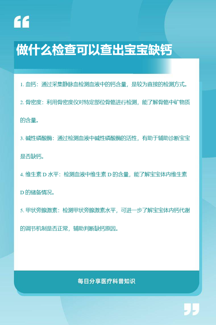 血钙、骨密度、碱性磷酸酶、维生素 D 水平、甲状旁腺激素等检查可以查出宝宝是否缺钙。