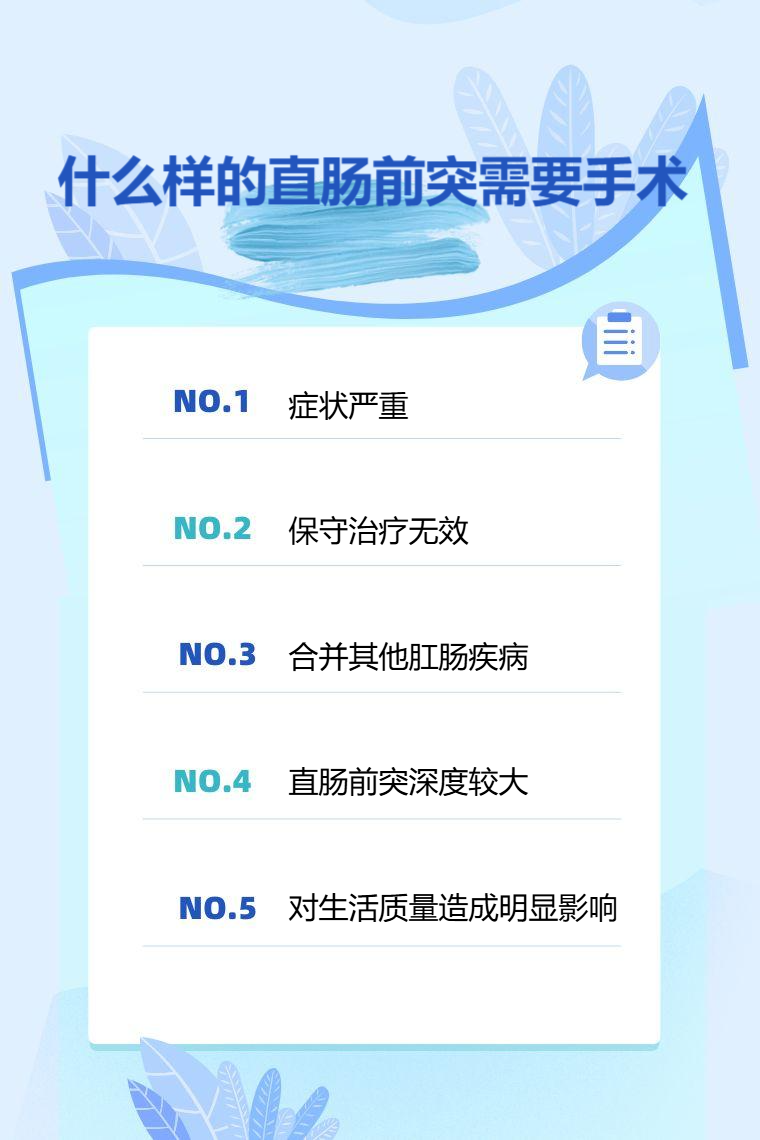 症状严重、保守治疗无效、合并其他肛肠疾病、直肠前突深度较大、对生活质量造成明显影响等的直肠前突需要手术。