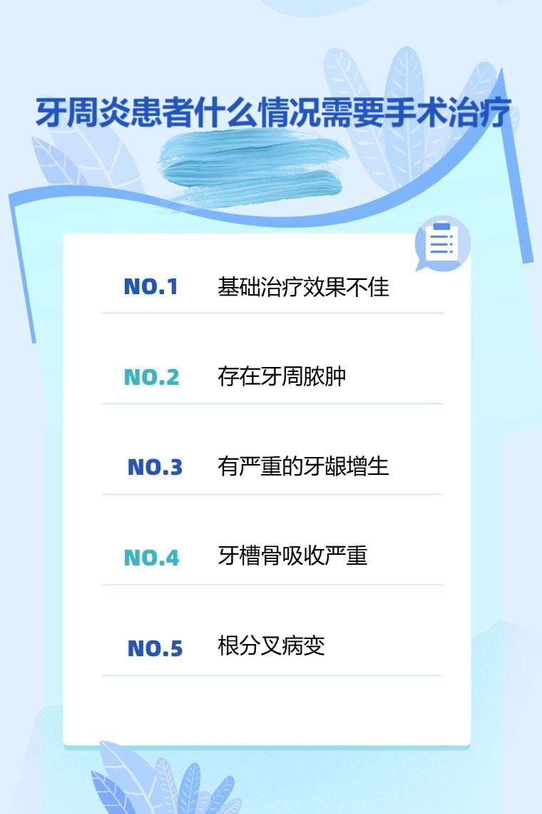 牙周炎患者在基础治疗效果不佳、存在牙周脓肿、有严重的牙龈增生、牙槽骨吸收严重、根分叉病变等情况时需要手术治疗。