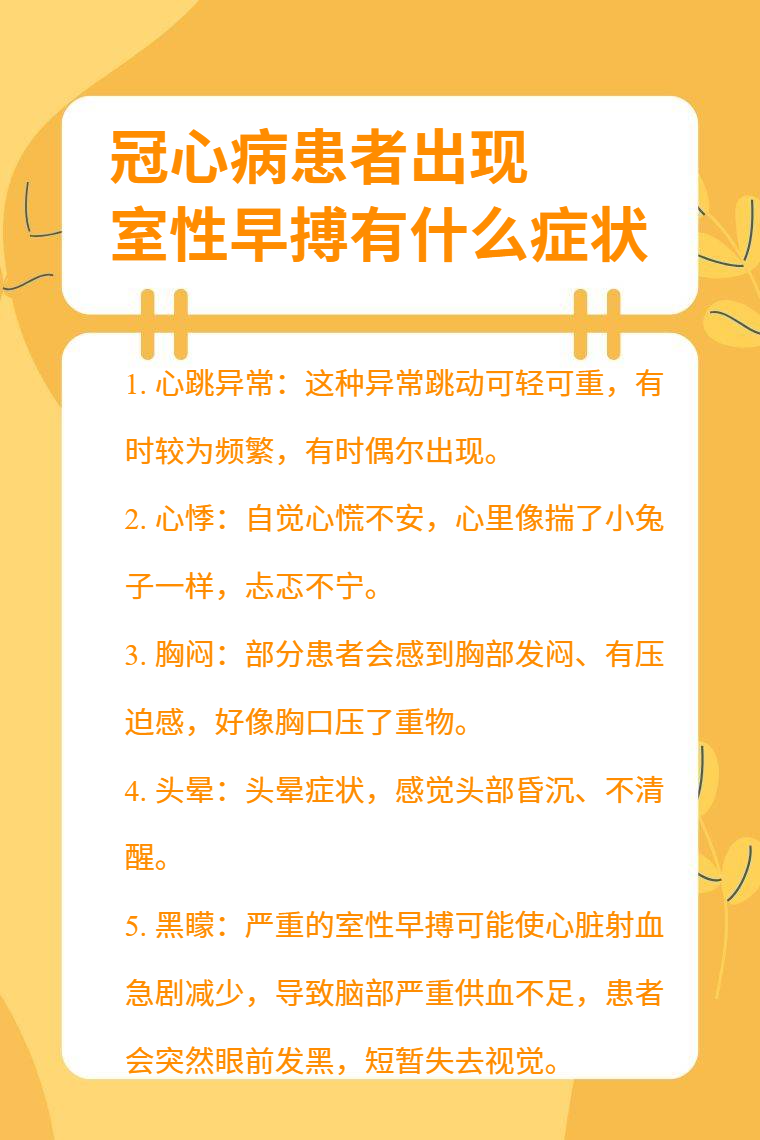 冠心病患者出现室性早搏的症状有心跳异常、心悸、胸闷、头晕、黑矇等。